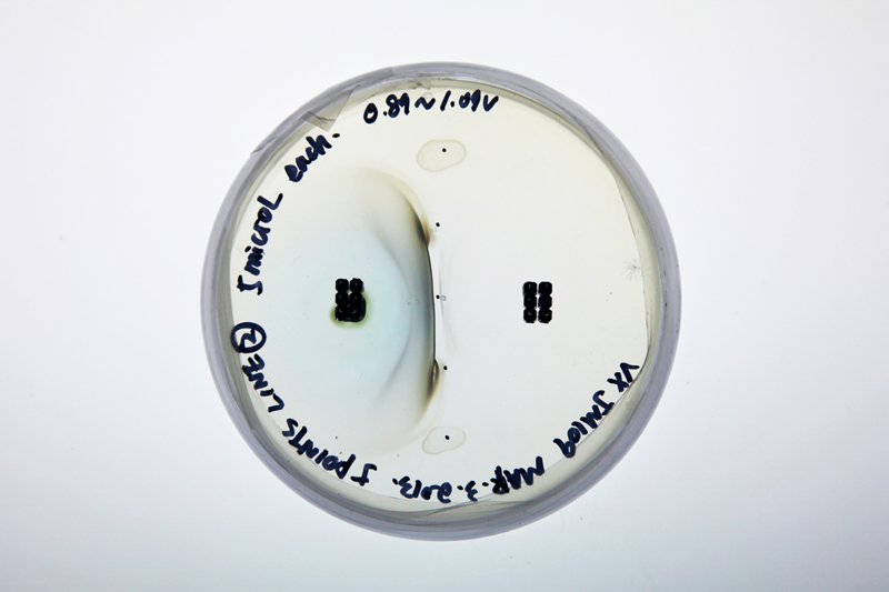 Living Devices is a series of research methods, lab protocols, hardware developments and experiment specimens that seek to break down the barrier between machine and organism by transforming electric signals into emergent bacteria growth patterns within a single device. The device allows access into the living system of bacteria through electric stimulation and manipulate their growth outcome to form visual pattern.