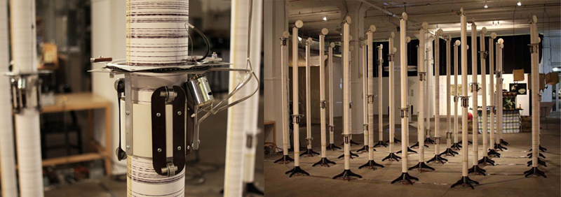 The first is the chemical computers[64] developed by British Cybernetician Gordon Pask. The [64] image presents a schematic of an electrode array embedded in ferrous sulphate, a conductive medium. Electricity flows through the material in unpredictable ways that form random circuits within matter[65]. Another example is the media art Irrational Computing created by the artist Ralf Baecker[66][67]. Through the work, Baecker tests the material, esthetics and potentials of the digital through computational experiments with semiconductor crystals, the material basis for information technology. The artist seeks to reveal the poetic boarder between “accuracy” and “chaos”. A final example is the project Silent Barrage, a collaboration between Philip Gamblen, Guy Ben-Ary, Peter Gee, Dr. Nathan Scott, Brett Murray and Dr. Steve Potter Lab[68][69]. The piece takes movement of the audience within the exhibition space and feeds it to cultured nerve cells in petri dishes, where neurological activity is then output to robotic poles that document the activity.